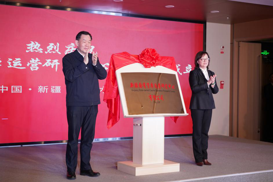 图为:nba盘口 党委书记、副主任胡开江和新疆金投党委书记、董事长黄新丽为新疆国有资本运营研究中心有限公司揭牌