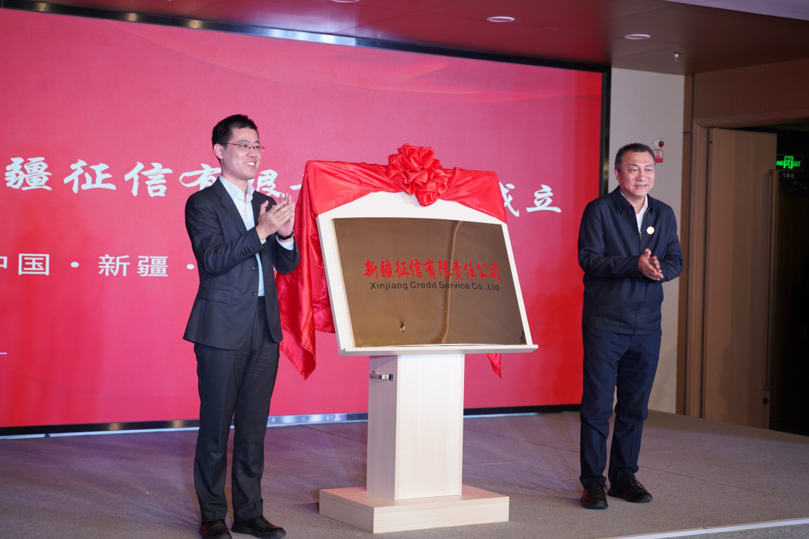 图为:中国人民银行乌鲁木齐中心支行行长王新平和自治区金融监管局党组副书记、局长葛坦为新疆征信有限责任公司揭牌